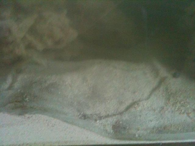 2nd pic shows two snails - one on the left and one on the right making tracks in the sand. Also seen a few small bristleworms in the sand through the glass, excuse me, acrylic. It'll take a little getting used too. lol