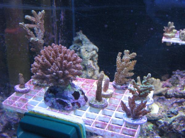 my camra skills suck sorry 2 red monti cap frags $10 each 1 green monti cap $10 1 green acro 5'' $20 1 green acro 2'' $10 5 or so small acros $10 each 2 digi 4'' $10 each plate coral $10 really nice 3'' muti green chalice frag $30 50lbs of live sand $20 also have lots of equipment for sale see my other post |